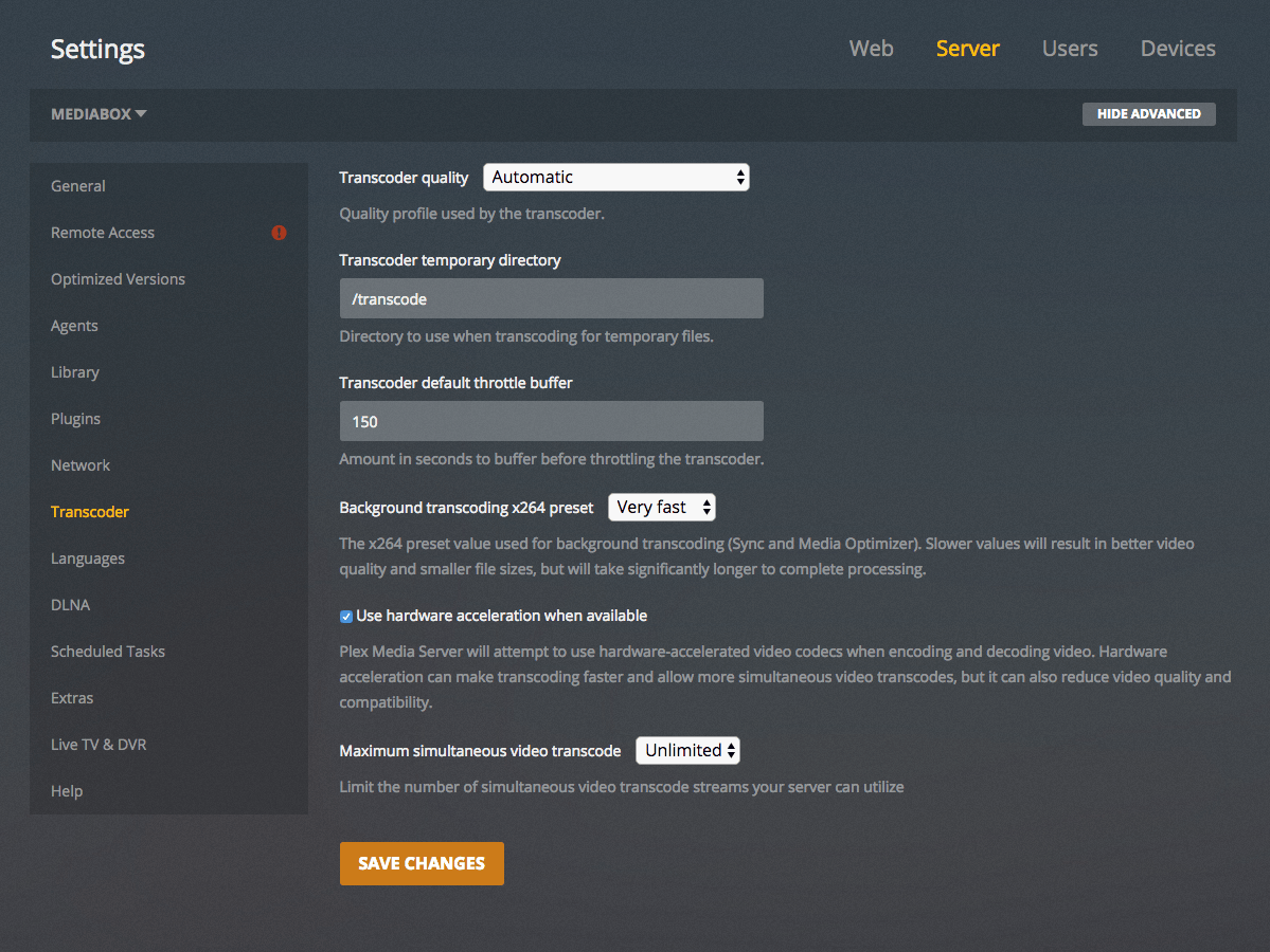 Click the Settings icon (top right) → "Server" (top) → "Transcoder" (left).