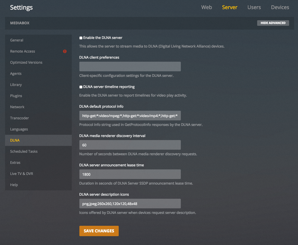 Click the Settings icon (top right) → "Server" (top) → "Library" (left). Click "SHOW ADVANCED" in the upper right.