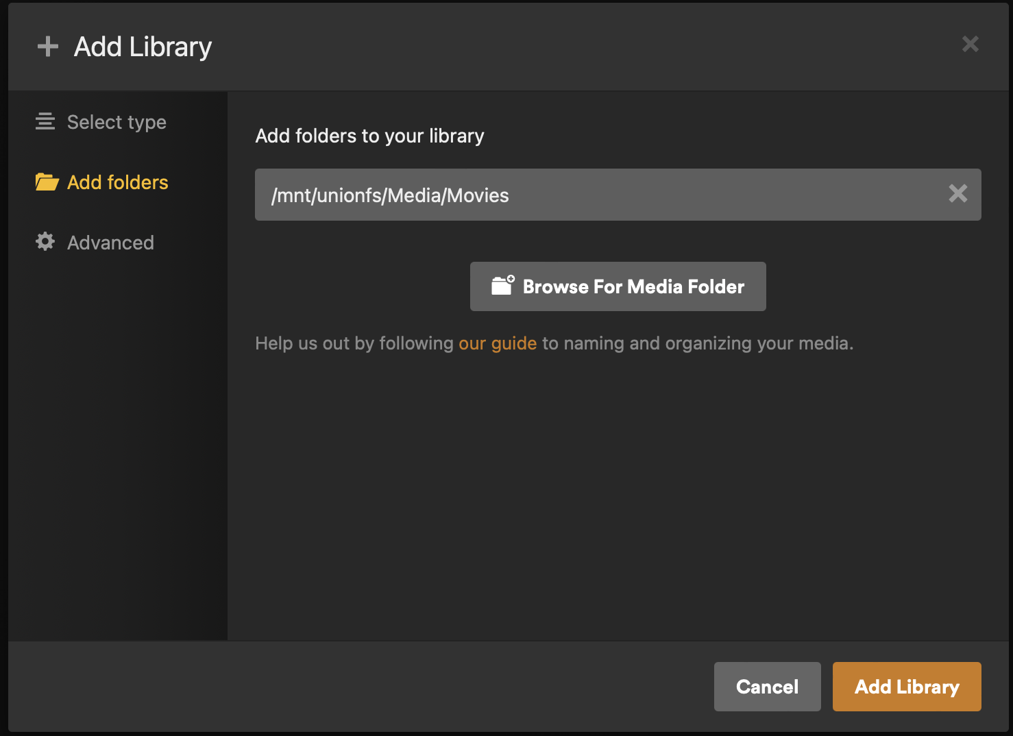 /mnt/unionfs/Media/Moviesin the text box (don't click "ADD LIBRARY" yet). -
