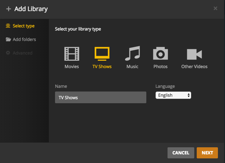 In the "Add Library" window, select "TV Shows" and click "NEXT".