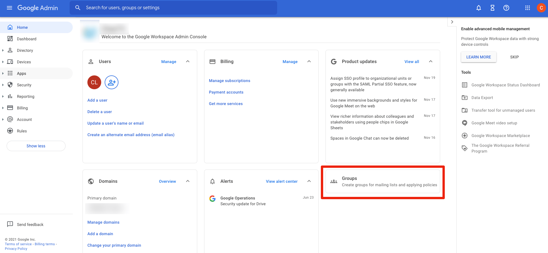 6. Open the Google Admin site: https://admin.google.com/ and login with your Google account. Click on the groups heading: